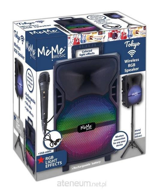Bezprzewodowy głośnik ze statywem i dynamicznym mikrofonem. Migające efekty świetlne LED RGB. Sterowanie światłem. Możliwość słuchania muzyki z USB lub za pomocą połączenia bezprzewodowego. Wybór poprzedniego/następnego utworu. Funkcja radia i regulacji mikrofonu. Zestaw zawiera kabel do ładowania. Wysokość wzmacniacza - 59 cm.