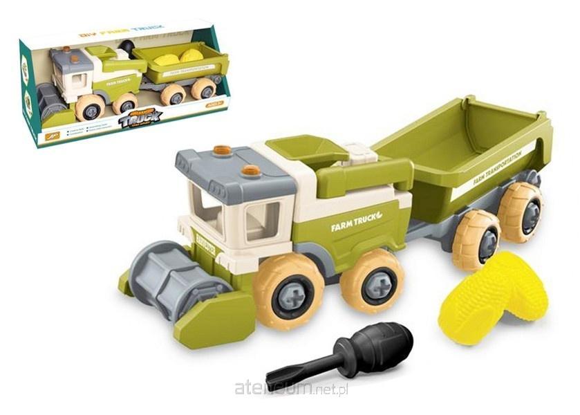 Kombajn rolniczy z przyczepą i akcesoriami. W komplecie śrubokręt do skręcania i rozkręcania pojazdu. Zabawka przeznaczona dla dzieci od lat 3. Całość zapakowana w kartonowe pudełko. Wymiary opakowania są wymiarami pudełka.