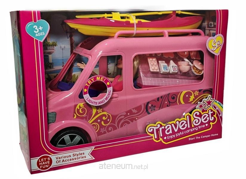 Różowy kamper z akcesoriami i lalką. Auto posiada światła i gra melodie. Na dachu znajduje się kajak, wewnątrz różne elementy do zabawy. Auto działa na baterie AG13. Baterie znajdują się w zabawce. Zabawka przeznaczona dla dzieci od lat 3. Zapakowany w kartonowe pudełko. Wymiary opakowania są wymiarami pudełka.