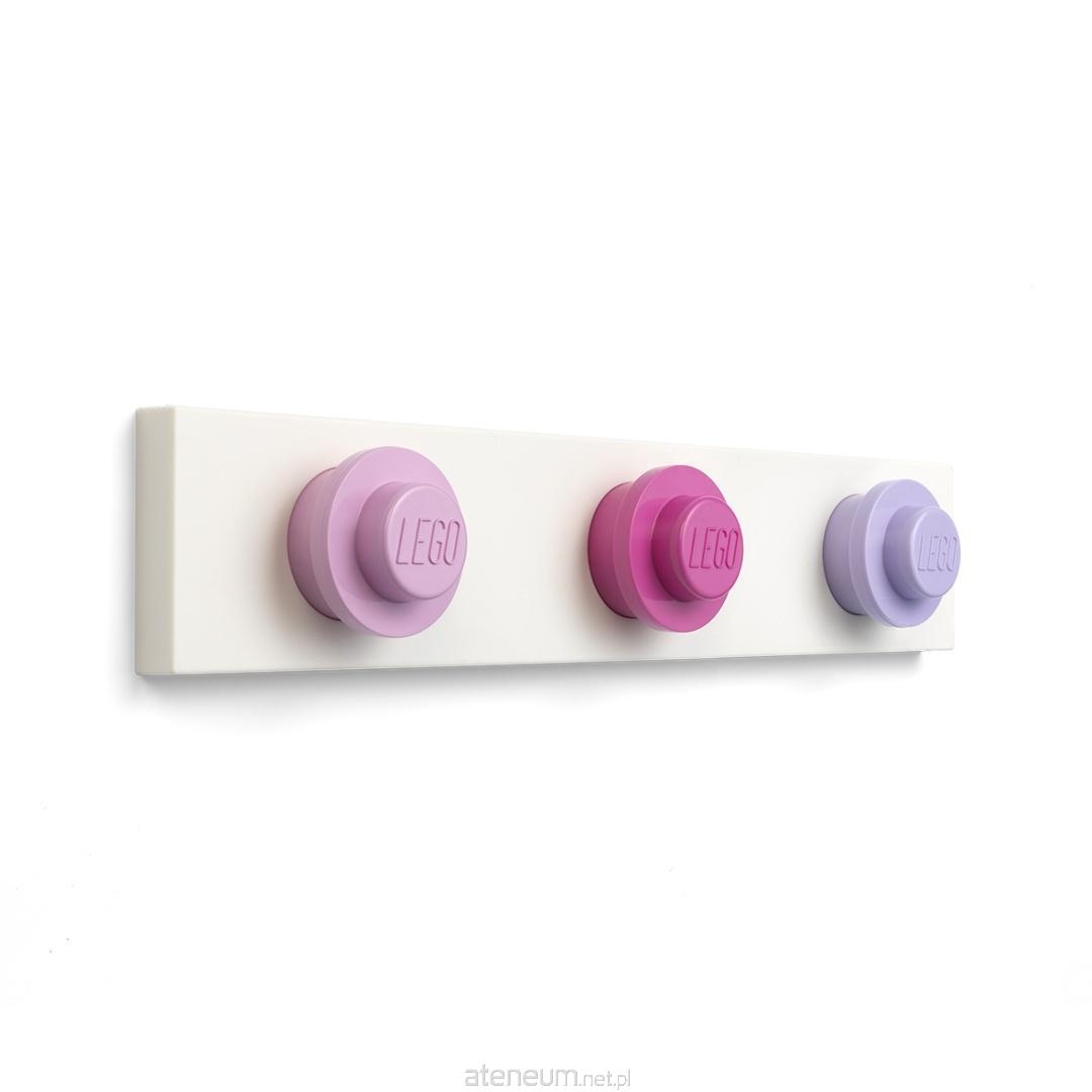 Listwa z wieszakami w kształcie klocków LEGO® w kolorach różowym, fuksji i fioletu.