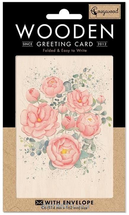 Drewniany karnet w formacie C6 z kopertą. W środku nie zawiera tekstu. Ten karnet jest w 100% biodegradowalny, wykonany przy użyciu minimalnego nakładu energii, gazu i wody. Jego wytworzenie zużywa 5 razy mniej drewna niż wykonanie karnetu papierowego. Karnet posiada certyfikat FSC, gwarantujący odpowiedzialne pozyskiwanie drewna. Wyprodukowany na Litwie.