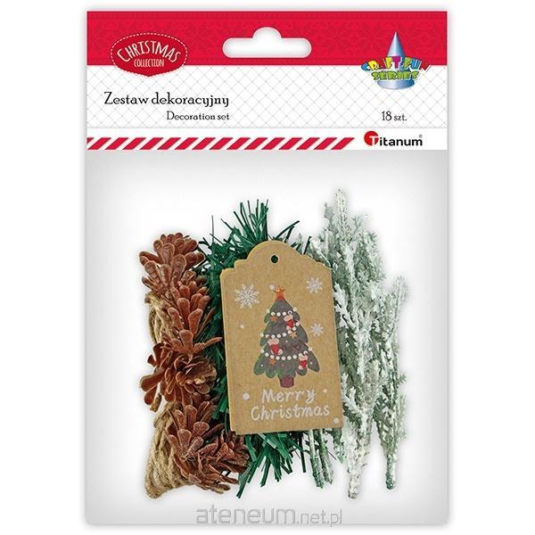 Zestaw do dekoracji prezentu: girlanda plastikowa długość 45cm, gałązki żywotnika ośnieżone 6szt., szyszki plastikowe 25x32mm 5szt., sznurek jutowy ok. 3m, zawieszka prezentowa 40x70mm 1szt.