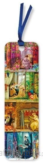 Pozłacana, papierowa zakładka do książki z ozdobną wstążką.
