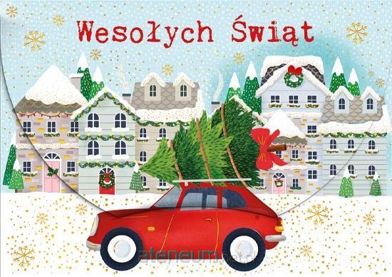 Karnet świąteczny poziomy, składany na kształt koperty w formacie B6, złocony z kopertą ochronną w zestawie.