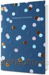 Karnet Konfetti formatu B6, z elementami złocenia lub srebrzenia. Front ozdobione w złote gwiazdki konfetti, które urozmaicają kartkę. Idealny wybór na wyjątkowe urodziny.