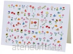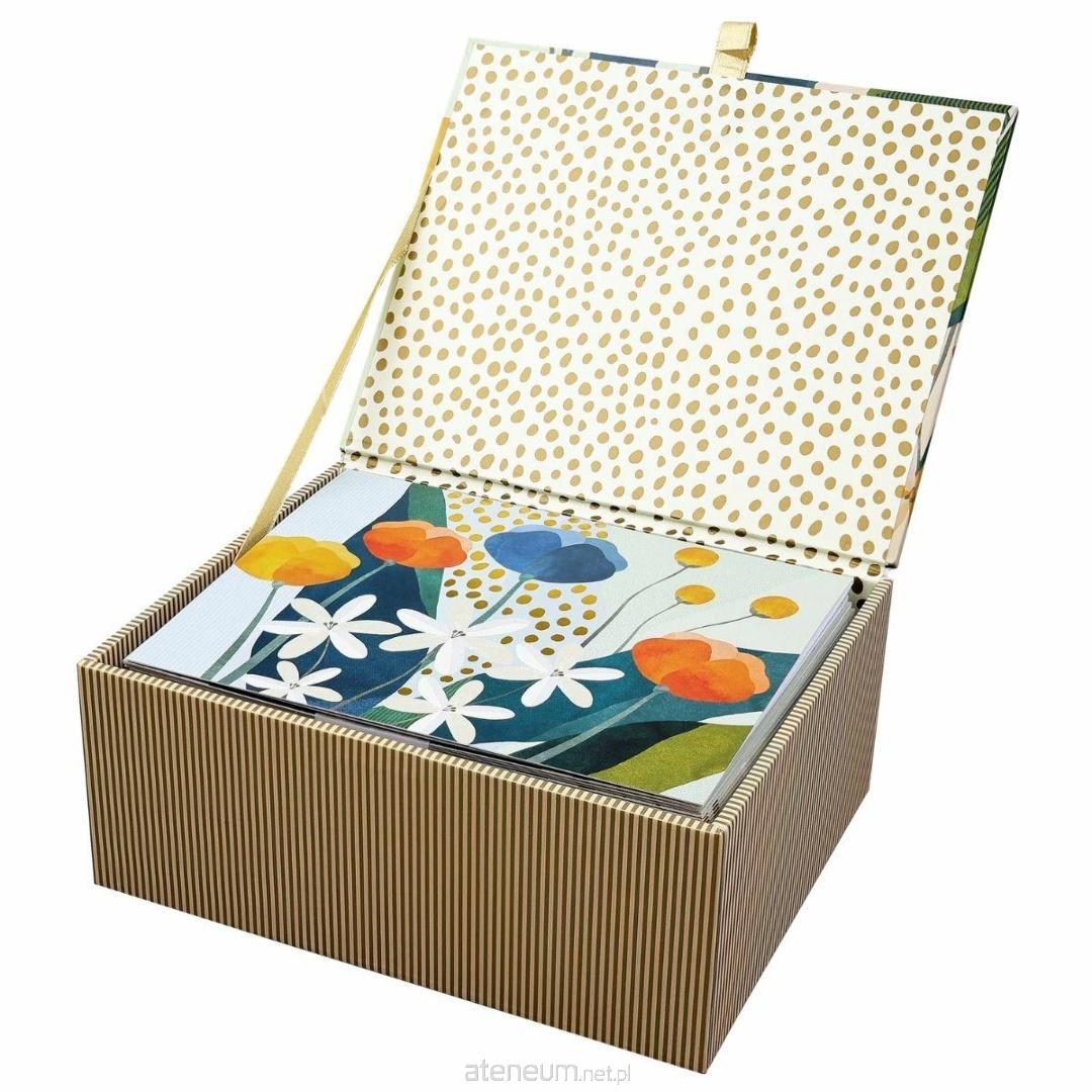 W zestawie znajduje się 20 wytłaczanych kartek z kwaitowym wzorem, po 5 sztuk z 4 dostępnych wzorów. Każda kartka posiada zdobienia ze złotej folii i kopertę ze złotym wzorem we wnętrzu. Całość została zapakowana w ozdobne, zamykane na magnes pudełko. Uniwersalna otwierana kartka okolicznościowa z pustym środkiem pozwala na pełną personalizację i stworzenie wyjątkowej pamiątki dla obdarowanej osoby.