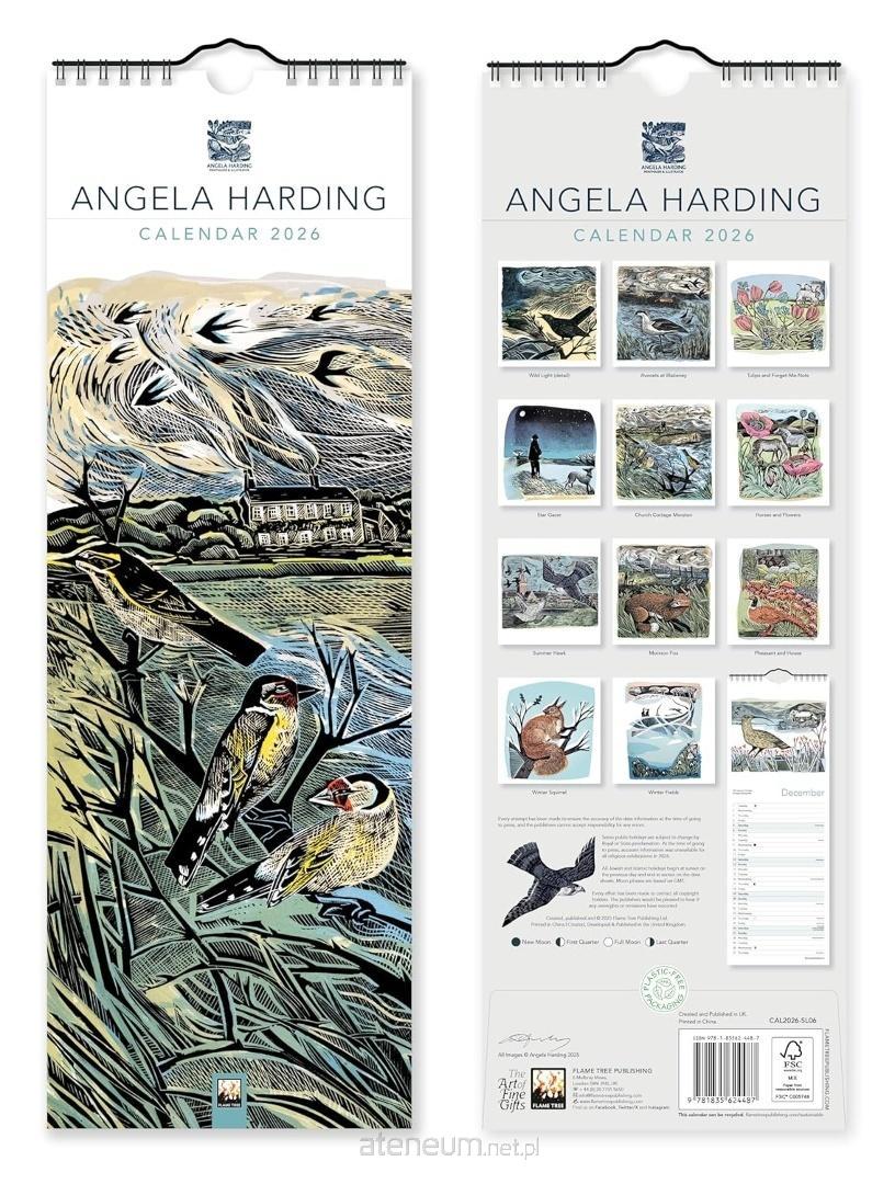 Kalendarz ścienny w formacie 420145mm, zatytułowany AngelaHarding Slim Calendar2026 (Art Calendar), wydany przez wydawnictwoFlameTree Publishing. Motywem przewodnim są urocze grafiki i linoryty autorstwaAngeliHarding, artystki specjalizującej się w ilustracjach inspirowanych brytyjską przyrodą i dzikim życiem. Na każdej z 12 stron prezentowane jest jedno z jej dzieł - zwierzęta w atmosferycznych, pełnych detali sceneriach - a poniżej znajduje się krótki tekst przybliżający kontekst twórczy.