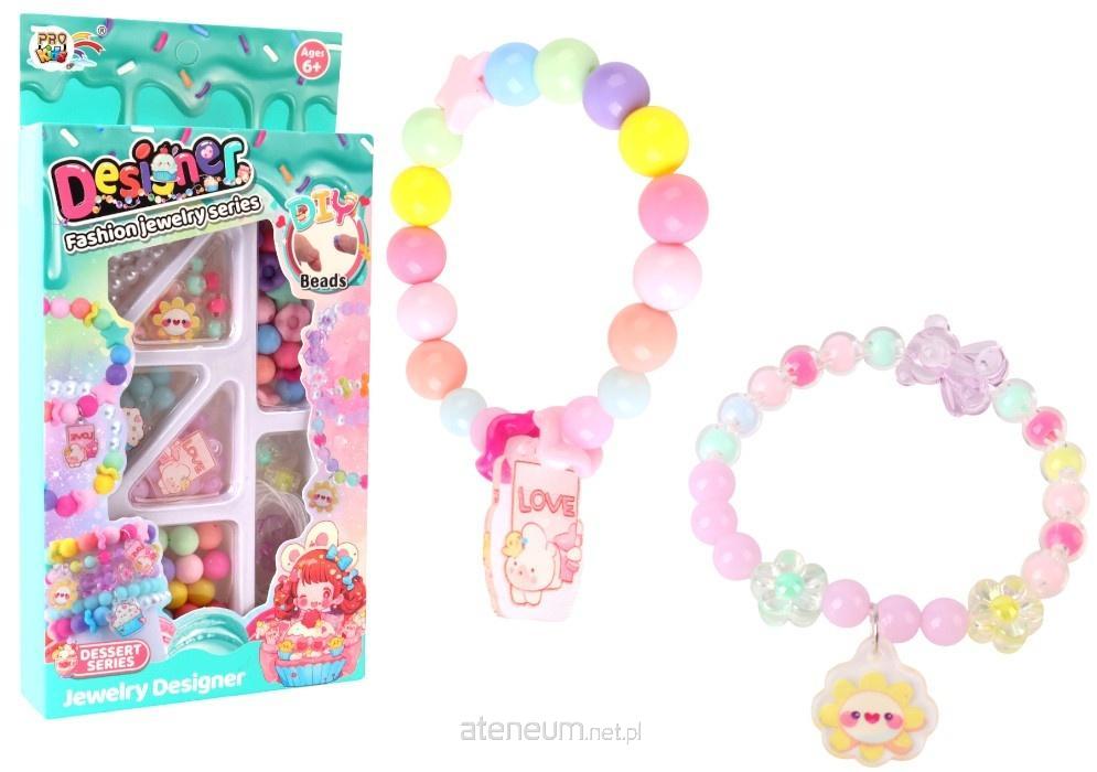 Zestaw Akademia Mody Designer NO.7 to kolorowa propozycja dla dzieci, które lubią tworzyć własną biżuterię w radosnym, pastelowym stylu. W pudełku znajdują się duże, gładkie koraliki w żywych kolorach, przezroczyste koraliki o perłowym połysku, elastyczny sznurek oraz zawieszki z uroczymi motywami postaci i kwiatów. Zestaw pozwala samodzielnie wykonać dwie różne bransoletki - pełne barw, lekkości i dziecięcego uroku.