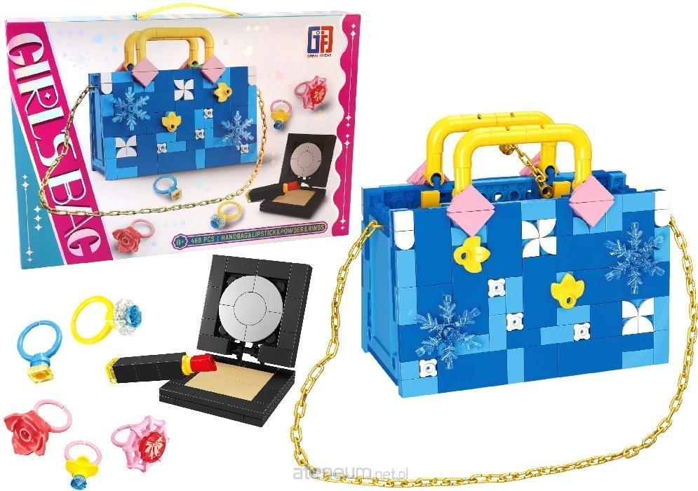 W zestawie znajduje się aż 468 elementów, dzięki którym dziecko może samodzielnie złożyć nie tylko torebkę, ale też zestaw akcesoriów w postaci pomadki, puderniczki i kompletu pięciu kolorowych pierścionków z efektownymi kamieniami szlachetnymi. Każdy z nich można naprawdę założyć to prawdziwa biżuteria w stylu glamour, stworzona z fantazją i wdziękiem.