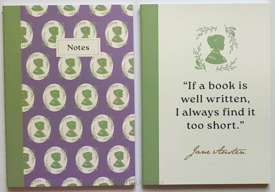 Zestaw dwóch zeszytów formatu A6 z motywem Jane Austen, to kwintesencja uroku i praktyczności. Każdy z notesów ma wymiary 10,7x14,8x1cm i wykonany jest z certyfikowanego papieru FSC, co podkreśla dbałość o środowisko. Zestaw jest estetycznie zapakowany, dzięki czemu stanowi stylowy i gotowy do wręczenia upominek.
