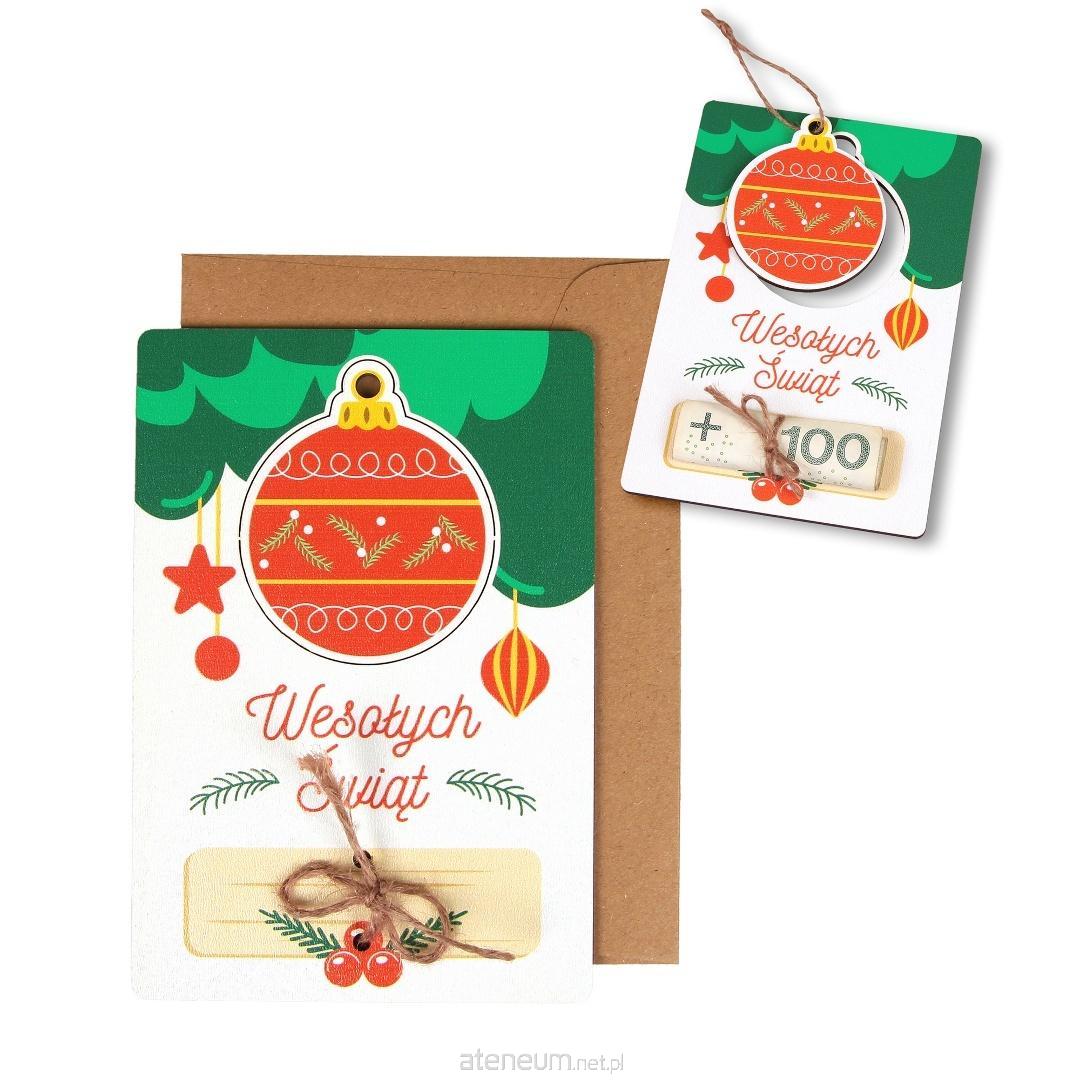 Drewniana kartka z kolorowym nadrukiem na Święta Bożego Narodzenia. Ciekawa alternatywa dla klasycznej kartki. Karnet zawiera dwa otwory wraz ze sznurkiem do przewiązania banknotu jako prezentu dla obdarowanej osoby. Dodatkowo jest laserowo wycięta bombka/zawieszka, którą wystarczy delikatnie wyłamać z kartki i może posłużyć jako dekoracja choinki.