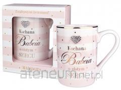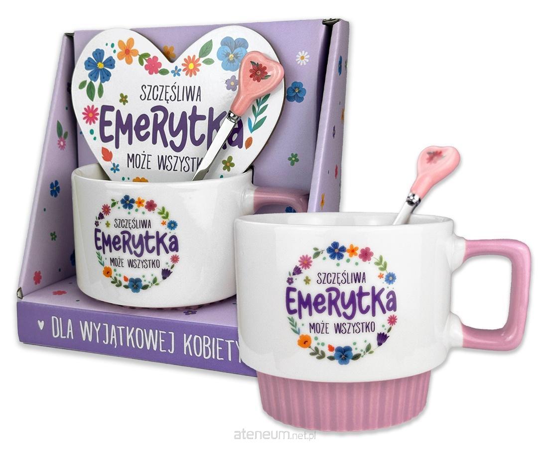 Zestaw prezentowy: kubek, ozdobna łyżeczka oraz podkładka pod kubek w kształcie serca.