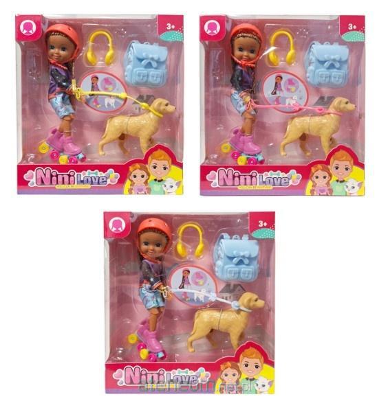 Lalka z psem na smyczy. W zestawie lalka w kasku na wrotkach, piesek, plecak i słuchawki. Produkt występuje w kilku wersjach kolorystycznych, wybierany losowo. Cena dotyczy jednej sztuki. Zabawka dla dzieci od 3 lat. Zabawka zapakowana w kartonowe opakowanie. Podane wymiary są wymiarami opakowania.