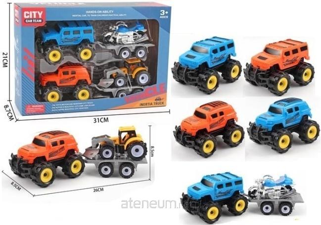Odkryj niezwykły zestaw samochodów terenowych City Car Team Inertia Truck, który zapewni godziny ekscytującej zabawy każdemu dziecku powyżej 3 roku życia. W tym podwójnym zestawie znajdują się dwa imponujące monster trucki z gigantycznymi kołami, jeden w jaskrawym kolorze niebieskim, a drugi w energetycznym pomarańczowym. Każdy monster truck ma dołączoną lawetę transportową z dodatkowym ładunkiem. Pomarańczowy pojazd ciągnie lawetę z realistycznie wyglądającym żółtym traktorem budowlanym, podczas gdy niebieski monster truck transportuje lawetę z dynamicznym motocyklem. Wszystkie pojazdy wyposażone są w wygodny w obsłudze napęd inercyjny, wystarczy je pchnąć, aby ruszyły do przodu, co wspiera rozwój koordynacji ręka-oko i umiejętności manualnych u najmłodszych. Pojedynczy zestaw z lawetą, na przykład pomarańczowy monster truck z traktorem, ma długość około 26 centymetrów. Jest to wspaniała propozycja dla przyszłych kierowców i budowniczych, łącząca zabawę w wyścigi i transport.