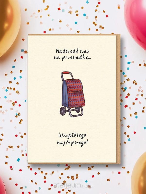 Czas na przesiadkę - z hulajnogi na wózek zakupowy! Kartka CZAS NA PRZESIADKĘ z lekkim humorem mówi o tym, że dojrzewanie (czytaj: starzenie się) to proces nieunikniony, ale można przeżyć go z klasą i uśmiechem.