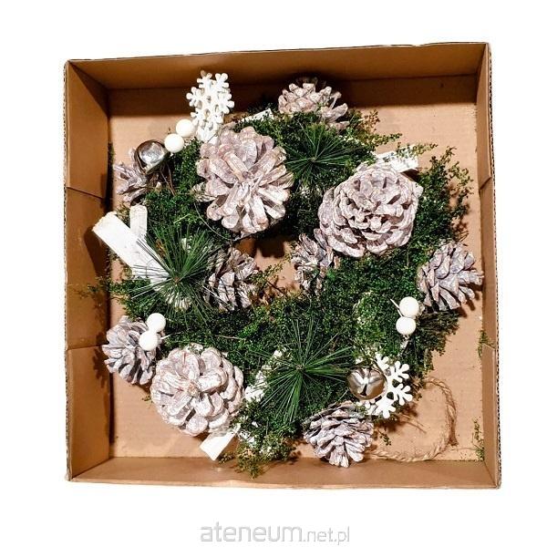 Elegancki stroik / wieniec na Boże Narodzenie, o średnicy około 25-30cm. Nadaje się do powieszenia na drzwiach, oknie lub położenia na stole. Otwór w środku pozwala na umieszczenie dużej świecy.