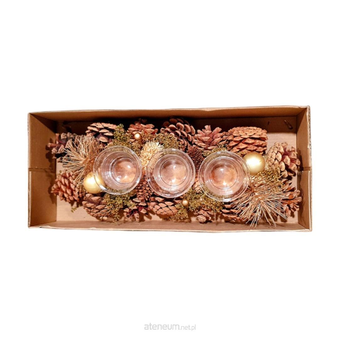 Elegancki stroik na Boże Narodzenie, o długości około 25-30cm. Nadaje się do położenia na świątecznym stole lub oknie. Naczynia w środku pozwalają na umieszczenie w nich trzech świec.