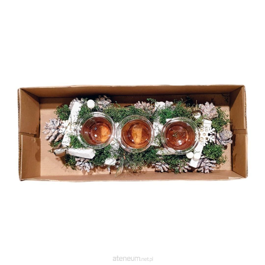 Elegancki stroik na Boże Narodzenie, o długości około 25-30cm. Nadaje się do położenia na świątecznym stole lub oknie. Naczynia w środku pozwalają na umieszczenie w nich trzech świec.
