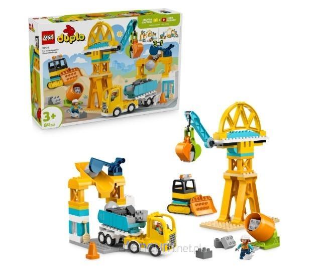 Zapoznaj małych budowniczych z zestawem klocków dla 3-latka LEGO DUPLO Plac budowy z pojazdami 3 w 1 (10476), z którym budowa nigdy się nie kończy! Dzieci w wieku od 3 lat zaangażują się w zabawę w budowanie, ładując i rozładowując ciężarówki oraz podnosząc i przenosząc głazy i klocki za pomocą różnych ciężarówek budowlanych LEGO DUPLO.