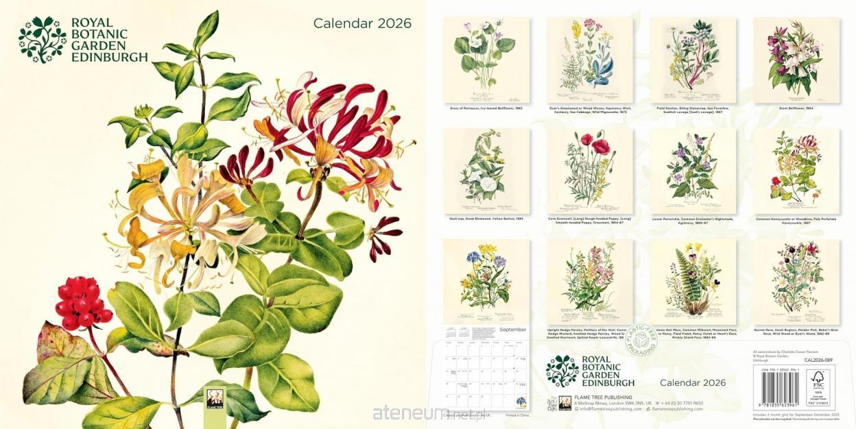 Kalendarz ścienny o wymiarach 300 300 mm, zatytułowany Royal Botanic Garden Edinburgh Wall Calendar 2026 (Art Calendar), wydany przez Flame Tree Publishing. Motywem przewodnim są delikatne i precyzyjne ilustracje roślin autorstwa Charlotte Cowan Pearson, które przenoszą do świata botanicznego piękna, pełnego detali i naturalnej harmonii.