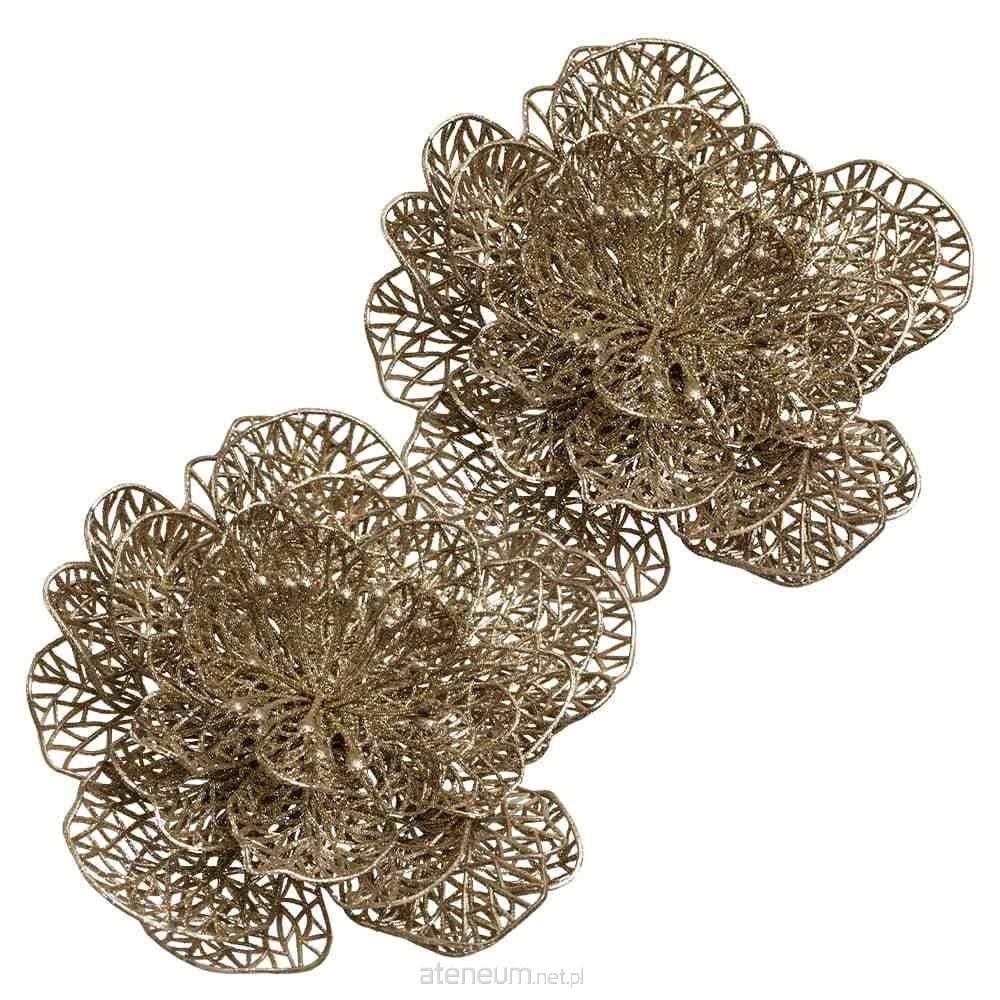 Ozdoby świąteczne w kształcie kwiatów to ręcznie wykonany zestaw dwóch sztuk o efektownym, unikalnym designie pokrytym brokatem. Każdy element został przygotowany z dużą dbałością o każdy detal. Dekoracje wykonano z plastiku, a wymiary pojedynczego kwiata to 110 110 50 mm. Złota kolorystyka sprawia, że ozdoby doskonale uzupełnią świąteczne aranżacje, w tym dekorację choinki. Każdy kwiat posiada nitkę umożliwiającą łatwe zawieszenie.