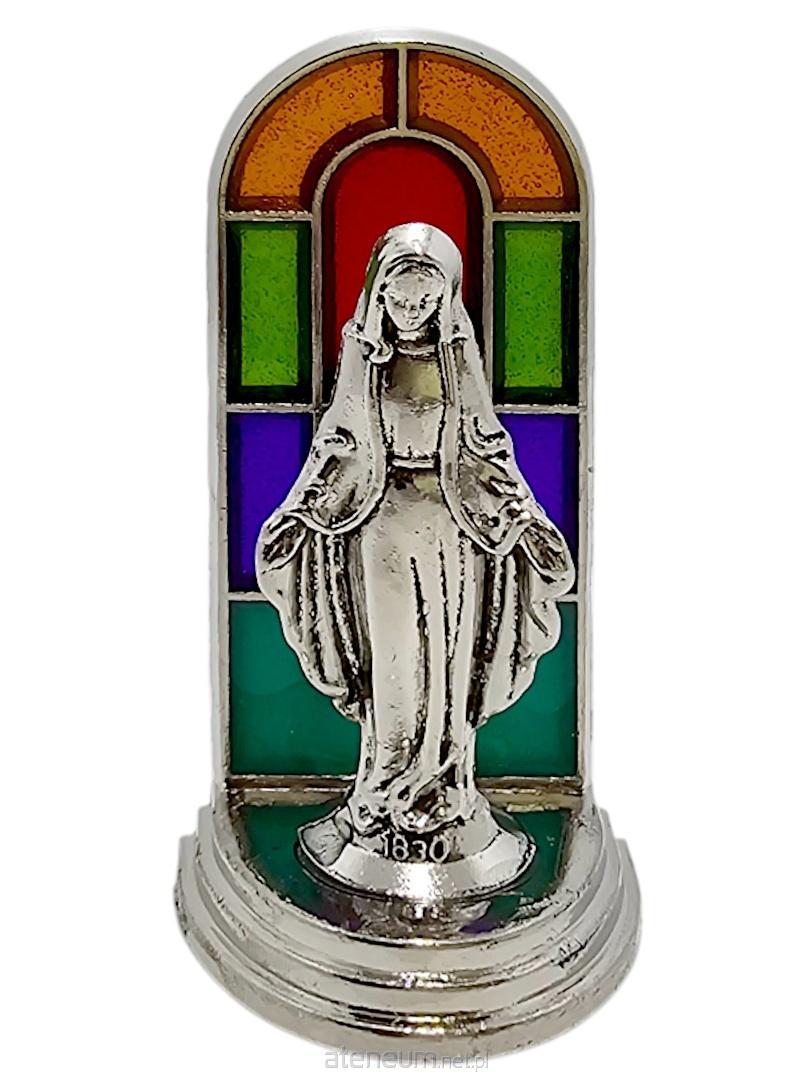 Elegancki design: Srebrna postać Matki Bożej i barwny witraż tworzą harmonijną całość.