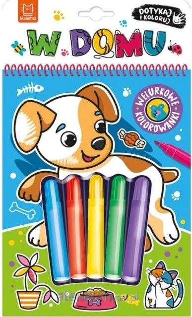 Dotykaj i koloruj. W domu to kolorowanka sensoryczna z dołączonymi pisakami. Tło obrazków pokrywa czarny welur, który podkreśla głębię kolorów, zapewnia wrażenia sensoryczne i ogranicza wychodzenie poza linię. Małych fanów i fanki zwierząt czeka spotkanie z naszymi pupilami. W tym gronie znajdą się ulubieńcy dzieci: kotek, chomik, piesek, żółw, papuga, królik, kameleon, rybka. Dzieci nie tylko pokolorują 8 uroczych rysunków. Przeczytają również wierszyki o zwierzętach z ilustracji. A dzięki perforacji pokolorowaną pracę mogą oderwać, włożyć do ramki i podarować w prezencie lub ozdobić nią pokój.