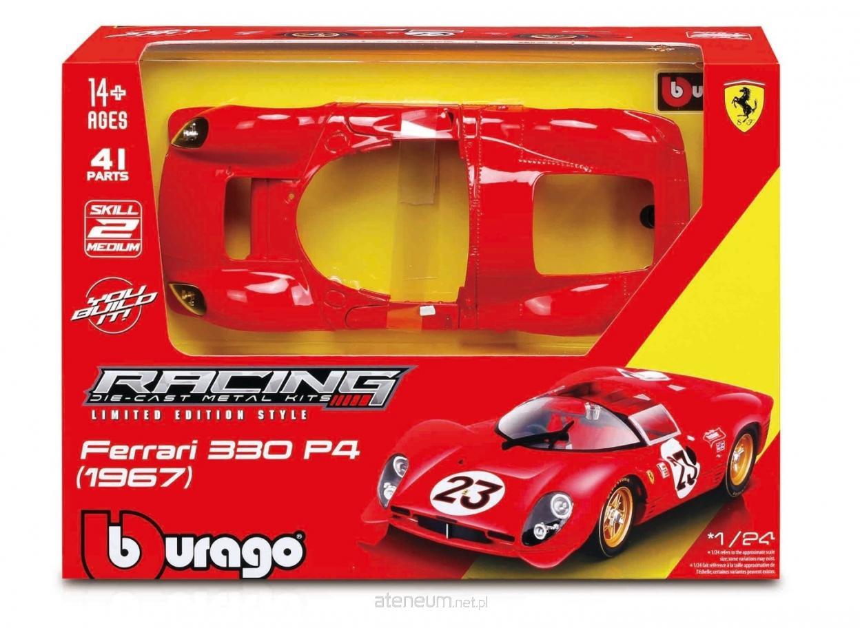 Ferrari 330 P4 Daytona 1967 oryginalny produkt marki Bburago, oficjalny, licencjonowany wzór pojazdu, metalowy model z plastikowymi elementami, perfekcyjne odwzorowanie szczegółów, model z serii KIT - do samodzielnego złożenia. Ruchome elementy: drzwi. Wymiary opakowania: 23 x 10 x 17 cm. Ferrari 330 P4 Daytona to model samochodu do składania bez kleju, z dołączonym śrubokrętem, który posiada polakierowaną metalową karoserię oraz ruchome elementy. Po złożeniu staje się w pełni funkcjonalnym, jeżdżącym pojazdem, idealnym jako zabawka dla dzieci lub model dla kolekcjonerów. Samochód ma otwierane drzwi, a opakowanie zawiera szczegółową instrukcję montażu, ułatwiającą składanie i zapewniającą satysfakcję z tworzenia.