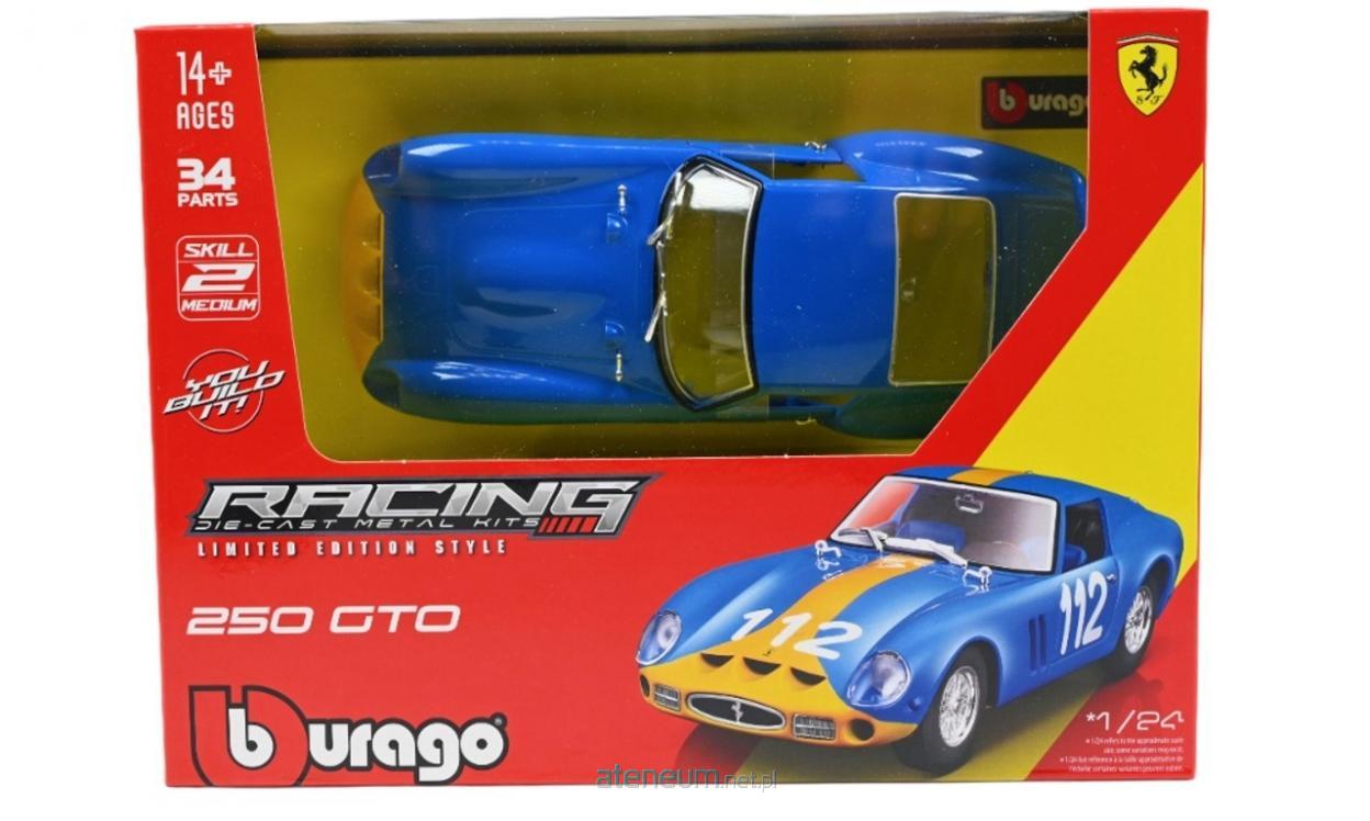 Ferrari 250 GTO oryginalny produkt marki Bburago, oficjalny, licencjonowany wzór pojazdu, metalowy model z plastikowymi elementami, perfekcyjne odwzorowanie szczegółów, model z serii KIT - do samodzielnego złożenia. Wymiary opakowania: 23 x 10 x 17 cm. Model samochodu do składania bez kleju, z dołączonym śrubokrętem, który posiada polakierowaną metalową karoserię oraz ruchome elementy. Po złożeniu staje się w pełni funkcjonalnym, jeżdżącym pojazdem, idealnym jako zabawka dla dzieci lub model dla kolekcjonerów. Samochód ma otwierane drzwi, a opakowanie zawiera szczegółową instrukcję montażu, ułatwiającą składanie i zapewniającą satysfakcję z tworzenia.