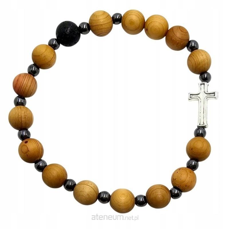 Odkryj unikalną bransoletkę na rękę, która swoim układem przypomina pełny różaniec. Wykonana na elastycznej gumce z 16 koralików o wielkości 8 mm: dziesięć gładkich drewnianych koralików oddziela jeden porowaty koralik z lawy wulkanicznej, a następnie pięć drewnianych koralików nawiązuje do zwieńczenia tradycyjnego różańca. Centralnym elementem bransoletki jest krzyż o wymiarach 15x10 mm. Pomiędzy koralikami umieszczona jest mała kuleczka z hematytu, dodająca subtelnego blasku. Minimalny obwód bransoletki to 18 cm. To ciekawe połączenie naturalnych materiałów tworzy wyjątkową ozdobę, która może być dyskretnym wyrazem wiary.