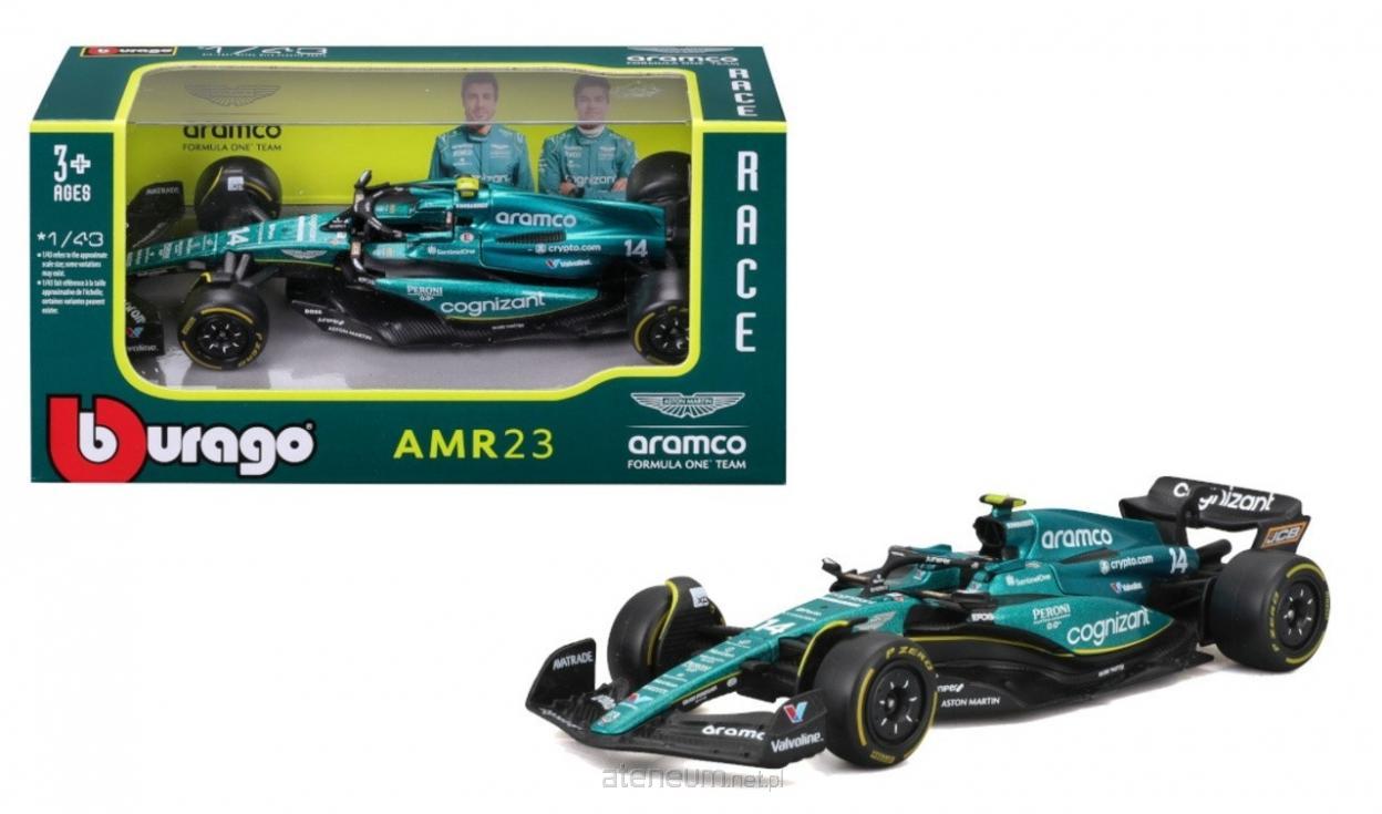 BOLID F1 Aston Martin Aramco Cognizant Team AMR23 (2023) #14 Fernando Alonso oryginalny produkt marki Bburago, oficjalny, licencjonowany wzór pojazdu, metalowy model z plastikowymi elementami, perfekcyjne odwzorowanie szczegółów. Wymiary: długość 13cm, szerokość 5cm, wysokość 3cm. Wymiary opakowania: 14 x 6,5 x 7,5cm. Aston Martin AMR23 to bolid Formuły 1, który zadebiutował w sezonie 2023, stanowiąc kontynuację dynamicznego rozwoju zespołu Aston Martin Aramco Cognizant Formula One Team. Zespół, prowadzony przez znanego wświecie motorsportu inżyniera Dana Fallowsa, wdrożył nowe rozwiązania w zakresie przepływu powietrza, zwłaszcza wokół tylnego skrzydła i dyfuzora, aby zmaksymalizować docisk aerodynamiczny. W efekcie AMR23 zyskał bardziej agresywny i wyrazisty wygląd, jednocześnie poprawiając stabilność przy wysokich prędkościach. Bolid, prowadzony przez kierowców Fernando Alonso i Lance\\'a Strolla, wykazywał się konkurencyjnymi osiągami, zwłaszcza na początku sezonu, co pozwoliło Aston Martin zbliżyć się do czołówki i powalczyć o miejsca w pierwszej piątce klasyfikacji konstruktorów.