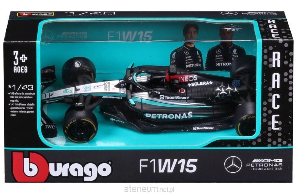 BOLID F1 Mercedes-AMG W15 (2024) #63 George Russell oryginalny produkt marki Bburago, oficjalny, licencjonowany wzór pojazdu, metalowy model z plastikowymi elementami, perfekcyjne odwzorowanie szczegółów. Wymiary: długość 13cm, szerokość 5cm, wysokość 3cm. Wymiary opakowania: 14 x 6,5 x 7,5cm. Mercedes-AMG F1 W15 E Performance to bolid Formuły 1 na sezon 2024, będący efektem gruntownej przebudowy po rozczarowującym sezonie 2023. W15 otrzymał nowe podwozie i obudowę skrzyni biegów, zmieniono również konfigurację tylnego zawieszenia z pull-rod na push-rod, co poprawiło stabilność tylnej osi, będącej wcześniej źródłem problemów. Aerodynamika została zoptymalizowana poprzez przeprojektowanie nosa i przedniego skrzydła, a także zastosowanie innowacyjnych bocznych wlotów powietrza w kształcie litery P. W15 napędzany jest przez hybrydową jednostkę napędową Mercedes-AMG F1 M15 E Performance. W sezonie 2024 bolid odniósł cztery zwycięstwa, w tym triumfy Hamiltona na torach Silverstone i Spa, oraz Russella w Austrii i Las Vegas, co zapewniło zespołowi czwarte miejsce w klasyfikacji konstruktorów .