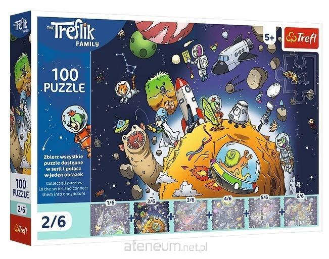 Treflik w w kosmosie (2/6), to puzzle 100 elementów i część niezwykłej kolekcji, która po złożeniu wszystkich sześciu zestawów tworzy jedną dużą, fascynującą ilustrację przedstawiającą międzyplanetarne przygody sympatycznej Rodziny Treflików.