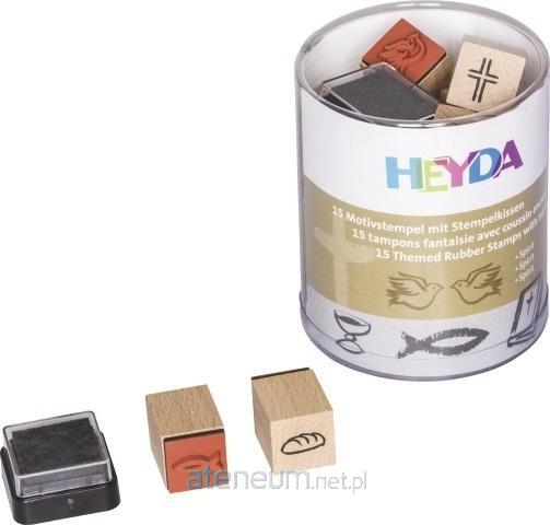 Zestaw 15 drewnianych stempli, każdy z innym motywem, o wielkości 3x3 cm (wzór odpowiednio mniejszy). Do zestawu dołączona jest poduszka nasączona czarnym tuszem. Motywy są ułożone tematycznie.