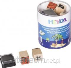 Zestaw 15 drewnianych stempli, każdy z innym motywem, o wielkości 3x3 cm (wzór odpowiednio mniejszy). Do zestawu dołączona jest poduszka nasączona czarnym tuszem. Motywy są ułożone tematycznie.