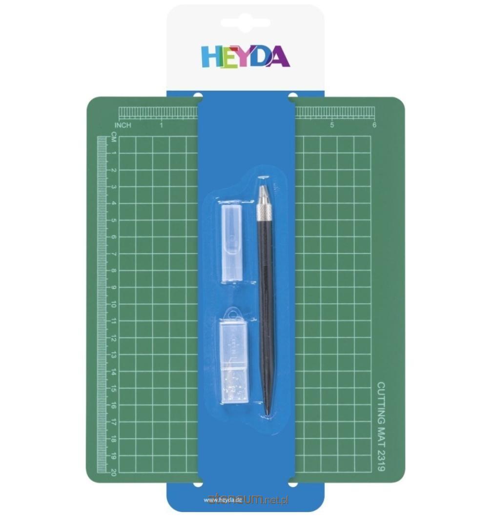 W skład zestawu wchodzi podkładka scalająca w rozmiarze 23 x 19 cm oraz skalpel z 6 zapasowymi ostrzami