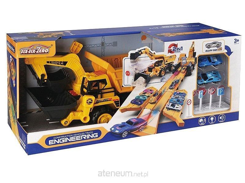 pojazd budowlany transformujący, z katapultą, 2 auta metalowe, znaki drogowe; 49,6x17x21,5cm