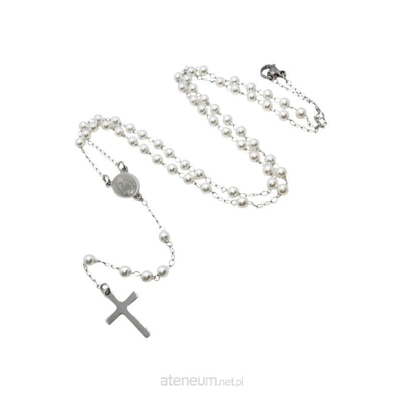Jego największym atutem są białe, subtelne kuleczki o wielkości 4 mm, które posiadają perłowy połysk. Lśniące w świetle koraliki dodają naszyjnikowi lekkości i kobiecego uroku. Całość wieńczy niesłychanie prosty i delikatny krzyżyk o wielkości 15x10 mm, harmonijnie dopasowany do subtelnej formy różańca.