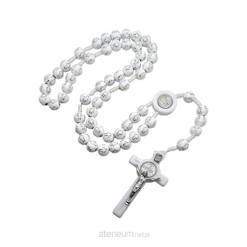 Różaniec został wykonany z trwałych, białych, plastikowych koralików o wielkości 10 mm, które są przyjemne w dotyku. Każdy koralik zdobią wygrawerowane krzyże wypełnione srebrnym kolorem, co nadaje całości eleganckiego charakteru. Łącznikiem jest medalik Świętego Benedykta, a całość wieńczy duży krzyż Świętego Benedykta o imponujących wymiarach 36x63 mm.