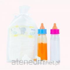 Alina ma na sobie uroczy liliowy komplet. Strój składa się z sukienki na krótki rękaw ozdobionej białym, drobnym wzorem. Dopełnienie zestawu stanowi bluza z kapturem z grafiką misia, białe rajstopki i materiałowe buciki. W zestawie nie mogło również zabraknąć smoczka z zawieszką misia, który jeszcze bardziej urozmaici dziecięcą zabawę.