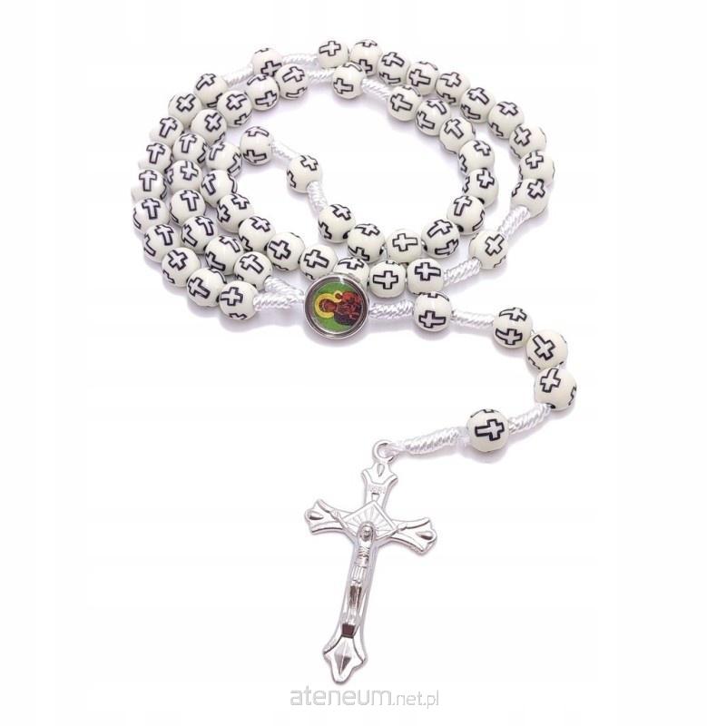 Odkryj piękno modlitwy z tym wyjątkowym, plastikowym różańcem. Białe koraliki, ozdobione czarnymi krzyżami, tworzą elegancki kontrast i nadają mu unikalny charakter. Centralny łącznik przedstawia wizerunki Jezu Ufam Tobie oraz Matki Boskiej Częstochowskiej, symbolizując zaufanie i opiekę. Całość zwieńczona jest metalowym krzyżem. Wykonany z trwałego plastiku i sznurka, różaniec jest lekki i wygodny w użytkowaniu.Idealny do codziennej modlitwy, jak również jako wyjątkowy prezent.