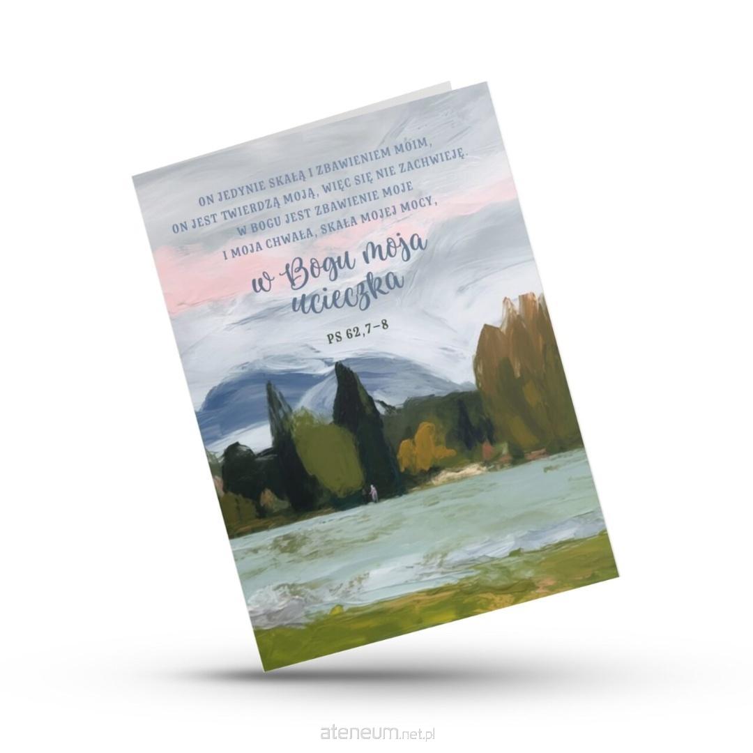 Kartka z cytatem z Psalmu 62,7-8 to przesłanie o sile i pokoju płynącym z Bożej obecności. Malarski pejzaż w tonach błękitu i zieleni podkreśla głębię i pokój, jaki daje zaufanie Bogu.