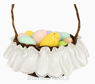 Serwetka ozdobna zakładana na koszyczek to elegancki dodatek, który efektownie wykańcza wielkanocny koszyczek od zewnątrz. Serwetka nakładana jest na krawędź koszyczka, tworząc dekoracyjną falbankę, która podkreśla świąteczny i odświętny charakter aranżacji. Ozdobny wzór z delikatnymi wycięciami i ornamentami nadaje całości lekkości oraz estetycznego wyglądu. Jasna kolorystyka sprawia, że serwetka harmonijnie komponuje się z naturalnymi koszyczkami i tradycyjnymi wielkanocnymi dekoracjami. Średnica 25 cm pozwala na wygodne dopasowanie do większości koszyczków.