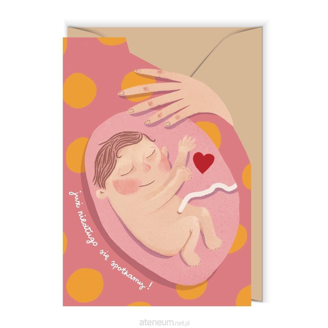 Wyjątkowa kartka okolicznościowa w kolorze brzoskwiniowym, z wycięciem i ilustracją kobiety w ciąży. Napis Już niedługo się spotkamy sprawia, że kartka idealnie nadaje się na powitanie maluszka, baby shower lub jako piękny dodatek do prezentu dla przyszłych rodziców. Projekt autorstwa Justyny Frączek łączy subtelną estetykę z emocjonalnym przekazem. Wykonana z ekologicznego papieru o wysokiej gramaturze trwała, elegancka i przyjazna środowisku.