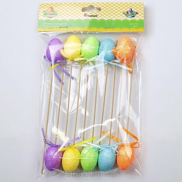 Dekoracje styropianowe jajka na piku brokatowe z kokardką 25x40mm żółte, pomarańczowe, zielone, niebieskie, fioletowe