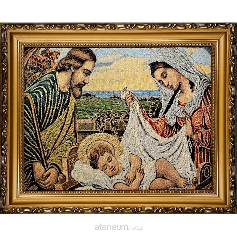 Zanurz się w ciepłej i pełnej miłości scenie Narodzenia przedstawionej na tym wyjątkowym, haftowanym obrazie Świętej Rodziny. Dzieciątko Jezus spoczywa spokojnie w łóżeczku, otulone czułą dłonią Maryi okrywającej Go szatką. Na tę pełną pokoju scenę spogląda św. Józef,trzymający w ręku swoją laskę pasterską, symbol opieki i troski. Piękne, stonowane kolory oraz subtelne złote nici nadają obrazowi wyjątkowego blasku i świętości. Całość oprawiona jest w elegancką, zdobioną złotą ramę o szerokości około 3 cm, która doskonale podkreśla intymny i wzruszający charakter sceny. Obraz o wymiarach 27,5 x 22 cm będzie stanowił pełną ciepła ozdobę każdego wnętrza i inspirujący element kontemplacji Tajemnicy Wcielenia.