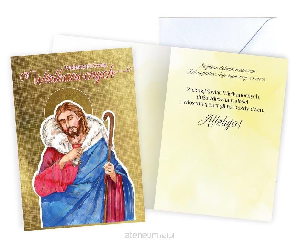 Kartka wielkości B6, zdobiona w zależności od wzoru metaliczną folią lub brokatem. Każda kartka posiada kolorowe życzenia w środku i dopasowaną kopertę w komplecie.