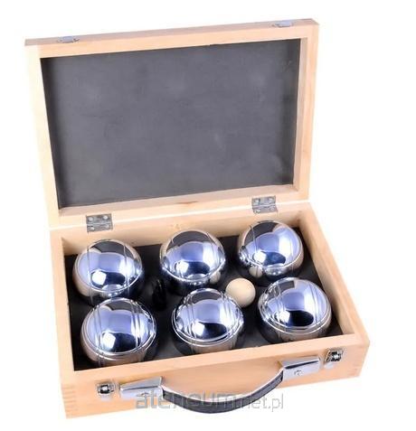Gra w bule, 6 metalowych kul, w tym but, miarka i zasady gry, w luksusowym drewnianym pudełku. Kule mają średnicę 74 mm i ważą 720 g.