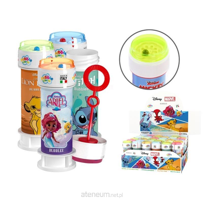 bańki mydlane z postaciami bajek Disney'a, na każdej nakrętce znajduje się gra - labirynt z piłeczką, ilość płynu w opakowaniu: 60 ml, wym. bańki: 11,5 x 3,5 cm., 3+