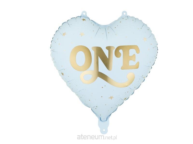 Balon foliowy Serce \\'\\'One\\'\\', w kolorze jasnoniebieskim ze złotym napisem. Wymiary przed napompowaniem ok. 45 cm (18\\'\\'), wymiary po napompowanie ok. 35 cm (14\\'\\'). Do napompowania powietrzem i helem. Zestaw zawiera słomkę.